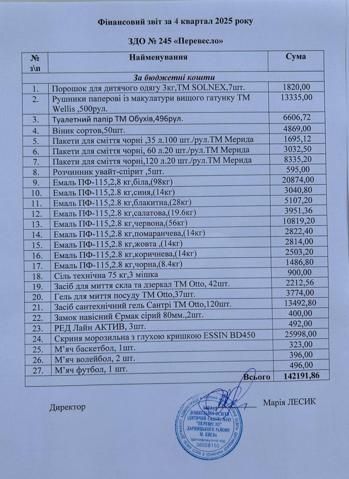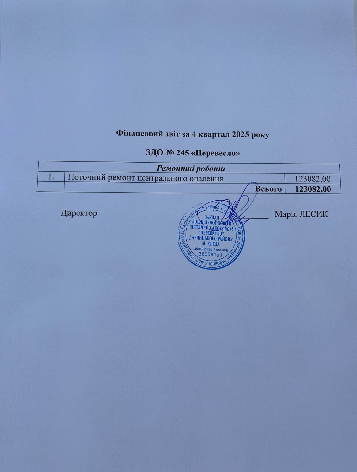 Звіт керівника дошкільного навчального закладу (дитячий садок) № 245 «Перевесло» Лесик Марії Андріївни за 2022 – 2023 н. р.